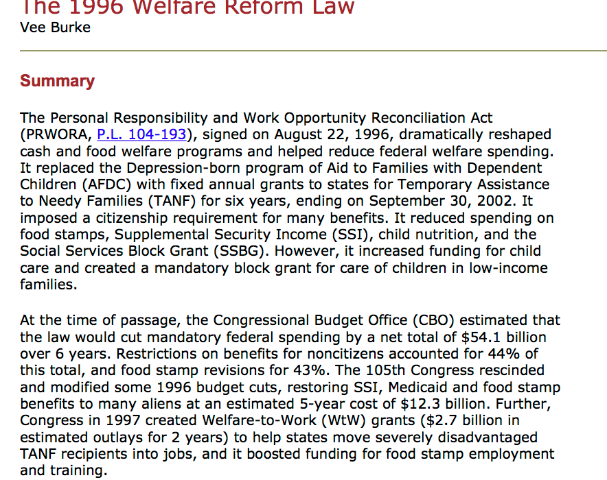CRS 2003 report by Vee Burke on 1996 Welfare Reform Law. (Short, but two images provided in this post).