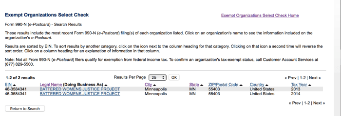 IRS Exempt Org. Select Check search for “990-N” filers under BWJP EIN# produced results for two years (FY2013 and 2014).