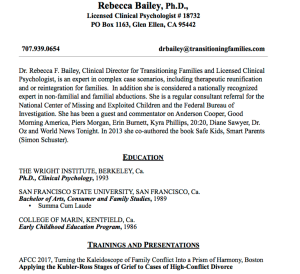 Rebecca Bailey PhD (Clinical psychology, the Wright Institute in BerkeleyCA, 1993) of “Transitioning Families” CV (Feb. 2016, per the url) showing ongoing AFCC strong ties + classic verbiage. Transitioning Families (her reunification program) + related to JayC Fndt’n (Jaycee Dugard abduction to N. California for 18 yrs)