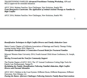 - Invited Pre-Conference Institute Presenter with Peggie Ward, Ph.D. and John Moran, Ph.D. Nuts and bolts of an intensive reunification intervention when a child resists a parent, AFCC 52nd Annual conference, New Orleans, LA, May 27, 2015.