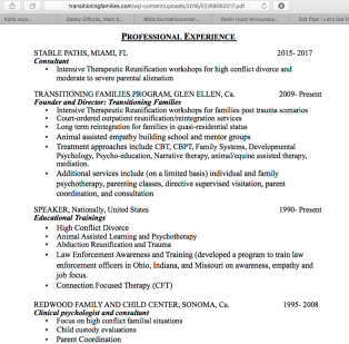 a quick look at the resume (dated Feb. 2016 per the URL) shows that AFCC, and key phrases associated with it (high-conflict, parental alienation, reunification, etc.) with a specific focus on abductions it seems, has been a court-connected career path with what otherwise might not be too much of an academic showing in the private sector (1993 PhD as Clinical Psychologist from the Wright Institute in Berkeley, nothing since…).