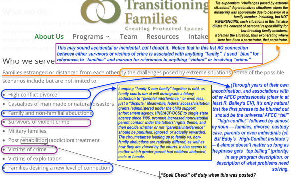 And yet here’s the two-word, trademarked phrase, “Transitioning Families,” which if you think about it, is unclear whether “transitioning” means “transitioning THE (alienated, disconnected, formerly separated by abduction, etc.) families” and is from a verb usage (making “Families” the direct object), or whether it’s meant to be an adjective, a “descriptor,” taken from the noun to describe such families, indicating a “from the sidelines” stance from those using the phrases — i.e., we observe that the families are just undergoing a “transition” — and we’re here to help them, and better facilitate it (through family-court-ordered reunification therapy…after which they should have “transitioned” to a more connected state.