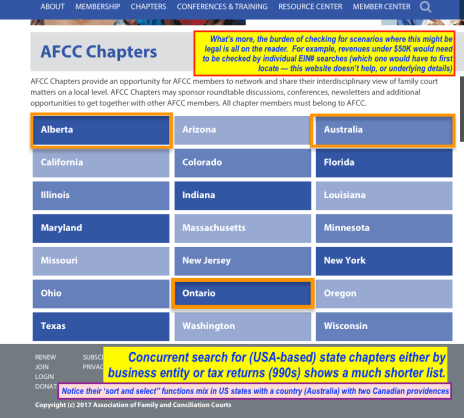 Searching for AFCC Chapters (name “AFCC” as shown in image) produces a list filling all either 990EZs, 990EO (Tx, bottom row) and for CT, a 990PF (and “FYI” it terminated itself FY2015). Note not all seem active. EIN# search for MA showed no others, just FYE2011 (note: Massachusetts court system has documented (earlier) close relationship with AFCC, linking directly to it at times on the state court website). NY, nothing past 2014.. Contrast this possibly with AFCCnet.org’s own declaration of its existing chapters (and I note its seeking to set up overseas chapters or affiliates now, too…) [[For active links, repeat the search…]] Some may show up as Forms 990-N at the IRS Select Exempt Org. check, perhaps…