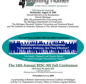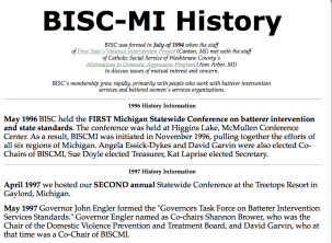 I’m inserting two BISC-MI images, though I’ve reported (and communicated privately) extensively on the situation before. These two images show, first, the start-up, and about 13 years later (Fall 2009) another conference showing involvement of (top part parts of Michigan State government + the “IDVAAC” (which isn’t an entity, but has a website tied to the University not of MICHIGAN but of MINNESOTA, with Dr. Williams at the helm), for one conference (Safe Return… i.e., from Prison), and for another clear endorsement by the USDOJ/VAWA of the “Coordinated Community Response” theory (Ellen Pence, DAIP-related), of which these batterers interventions, parent education, judicial education, training law enforcement to alter the “criminal response” to domestic violence — and of course, “Supervised Visitation” are consistently parts, year after year. Guess which professions this makes public-funded and/or private-extorted (through family or other court orders) profits for, although no doubt many service providers operate tax-exempt? …. those fields.http://www.biscmi.org/aboutus/history.html