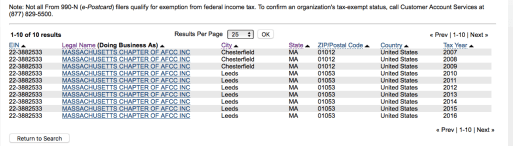 MA AFCC IRS Form 990-N list + from Mass Articles of Inc (board). For 2007+2008 this means total gross revenues under $25K; and for 2009ff, revs under $50K. I’d call this “maintaining a low profile.” I also question that no such operations involving cash flow (such as conferences or trainings) under this chapter name occurred before FY2007, or FY2002.