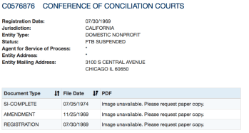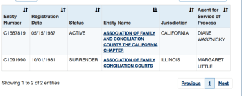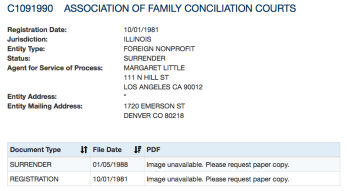 California Sec. of State (Business Entity Search) results: The Chapter (1987ff) is now active, but the original Association of Family (no “AND”) Conciliation Courts in Illinois “Surrendered” (that means voluntarily). It doesn’t say when, though.