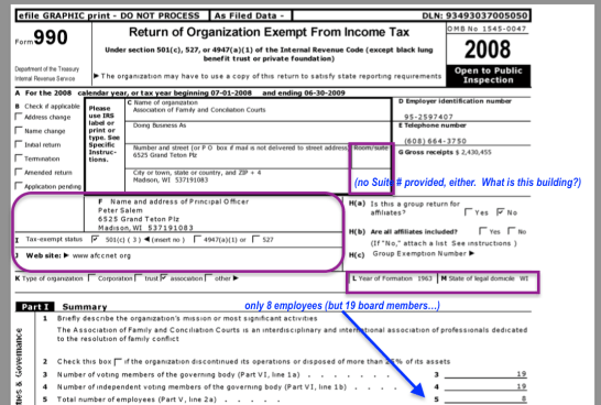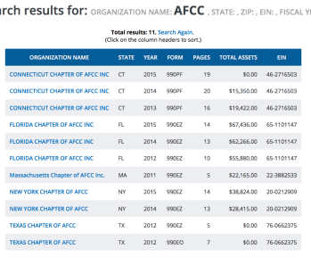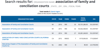 (This would be review, but maybe as a footnote to this post: I see that the acknowledged chapters of AFCC or (chapters under the name, written-out) have been “dropping like flies” so far as searchable tax returns are found, and that those still — or recently — existing have been filing either 990EZs (which strategically avoid reporting “founded” date and other data), 990Os, and (The Connecticut Chapter, which went through some public humiliation around 2011ff, thanks in part to this blog, and simultaneous and published in some more main stream on-lines, the work of investigative journalist (not to mention, mother and also family court veteran) Anne Stevenson more locally (to CT) by digging up and documenting their non-registration activity (for decades) in the state, and problems this posed) even a single “990PF“.