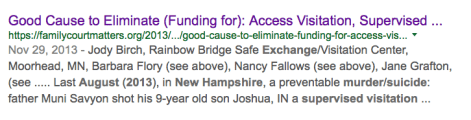 I also posted on it. (August 29, 2013, my post came up on the search results for this incident). The post has a lot of organizational detail on both a SF “Rally Visitation Center” and the professionalization of this at the state level, connection to (known) AFCC person active at the top state level (Judicial Council/AOC/CFCC) on the Access and Visitation funds, Shelly LaBotte, and there seems to have been some religious connections involving both Rally, as well as to some of the names listed on the “California Association of Professional Supervised Visitation Providers) to a Los Angeles area church of dubious registrations. I see on reviewing that (long) post, for those who may be interested, at the time I tracked millions of dollars direct to a Protestant evangelical-, digital-multi-campus (etc.) style church in Florida; including of course HMRF funding. It must’ve been after this that TAGGS changed its database, judging by the appearance of the tables posted therein.The reference to the NH supervised visitation tragedy is towards the bottom of that post.