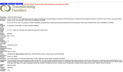 I did find a cancelled LLC registration for “Transitioning Families” in Glen Ellen, California (the USPTO trademark registration, was at a PO Box in the same, small town. The website seems to contain no contact mailing address at all). Its registered agent in 2016 (Charles Holmes), then a 2017 filing added Rebecca Bailey’s name to it and confirmed it was the same (“Type of Business: “Hold Trademark, Treatment Programs”) and later the same month voluntarily dissolved, or as I guess SOS search results call it, “cancelled.”