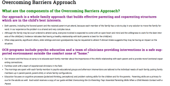 …”Overcoming Barriers’ Family Programs are psycho-educational programs that include all members of the family, including significant others and step-children, and were developed and continue to be implemented by its clinical founders, Drs. Peggie Ward, Robin Deutsch and Matthew Sullivan who are leading specialists, independently practicing clinicians and presenters in the fields of separation and divorce, child development and Parenting Coordination.”