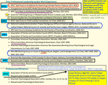 AFCC has been grrr–eat to Robin Deutsch for filling out the resume. For example (just an example) in 2015, out of ALL the above presentations (count the bullets) listed, only one (regarding topics AFCC specializes in) wasn’t actually an AFCC conference, but to the Family Law Section of NY State Bar Association. One might fairly question whether this professional can afford for her loyalties to lie anywhere BUT to this organization, and whether this might legitimately impact world views, and points of reference for measuring, say, ethics, and expert opinions: