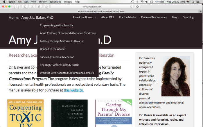 Amy JL Baker PhD, career PAS lecturer, author, problem-solver (the problem being, PAS..), $230/hr (Teleph coaching) or buy Restoring Family Connections manual, get trained and advertise your services here, targeting ADULT alienated children + parents…[5 images total]