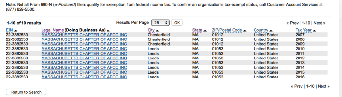 MA AFCC IRS Form 990-N list + from Mass Articles of Inc (board). For 2007+2008 this means total gross revenues under $25K, 2009ff, revs under $50K.
