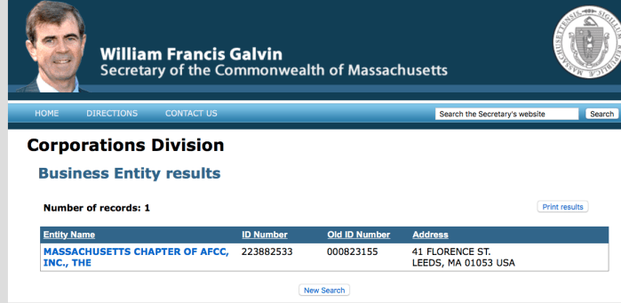 Revisiting Reunification Camps: The Nice Clinical Psychologists involved Just Want to Help Traumatized Kids and “Families in Transition” (or “Transitioning Families”), in “protected spaces” (away from naysayers, critics, and potential negative witnesses) … It’s the Good Ole, Time-Tested, Court-Ordered and of course (™)’d Way [Publ. Dec. 21, 2017]. » MA chapter of AFCC listing at Commonwealth Sec of State (formed in 2002) 2017Dec19 @6.49PM