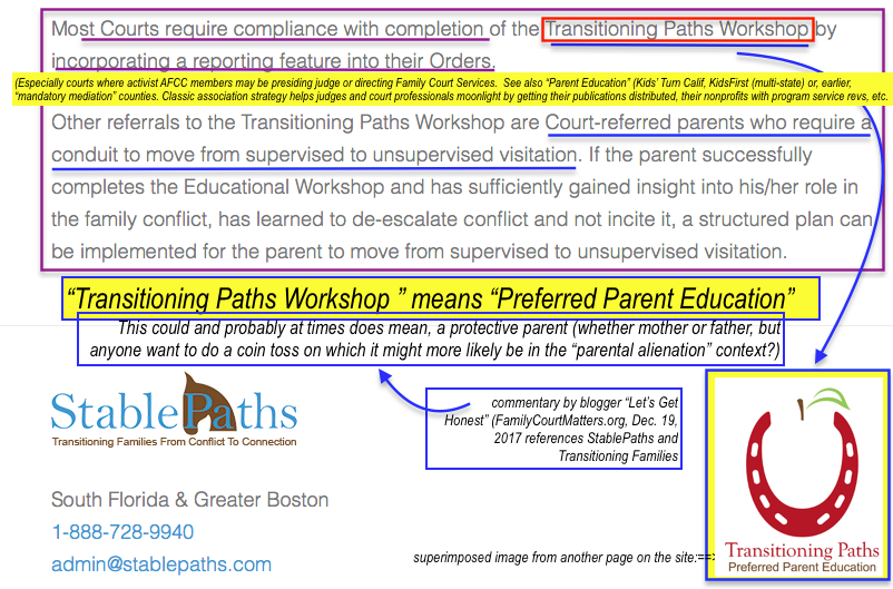 Revisiting Reunification Camps: The Nice Clinical Psychologists involved Just Want to Help Traumatized Kids and “Families in Transition” (or “Transitioning Families”), in “protected spaces” (away from naysayers, critics, and potential negative witnesses) … It’s the Good Ole, Time-Tested, Court-Ordered and of course (™)’d Way [Publ. Dec. 21, 2017]. » StablePaths (Transitioning Families from Conflict to Connect’n (Abigail Judge promoting AFCC, Amy Baker et al) ~2017Dec19 Tue @6.40.16 PM
