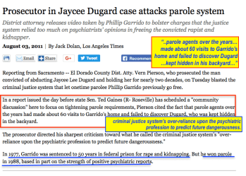 Here’s a link to (read the rest, although I’m providing one image) a July 2, 2010 Los Angeles Times article on the State of California’s $20 Million settlement with the Dugard family. It notes that the state offered the settlement before lawsuit was filed, in an unusual move, and that the legislature voted in favor of it 70 to 2 and 30 to 2, in light of the unique situation of her captivity. And that had it gone to trial, the state could’ve been liable for a whole lot more.