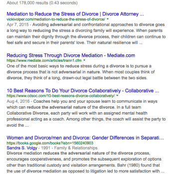**Search results (phrase added after publication) will bring up ads for mediators and collaborative divorce organizations or providers. It will at times also bring up nonprofits whose chairman of the board, president (etc.) or founder has direct connections to court-mandated mediation services. Without getting into too many details (on this post…), the “Collaborative Divorce Solutions of Orange County (CDSOC, in “SoCal,” Southern California) (see nearby image and caption) mentioned a nonprofit which website (oddly) gave its own EIN#.