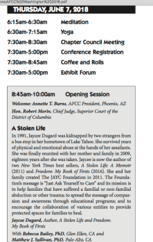 Img #2 of 5: AFCC’s 55th Annual Conf featuring Jaycee Dugard [+ Rebecca Bailey, and JayCFndtn (adv)] early June 2018 in DC (among the advertisements near the back of conferenced brochure. Donate to JAYC foundation?