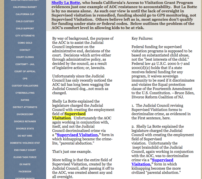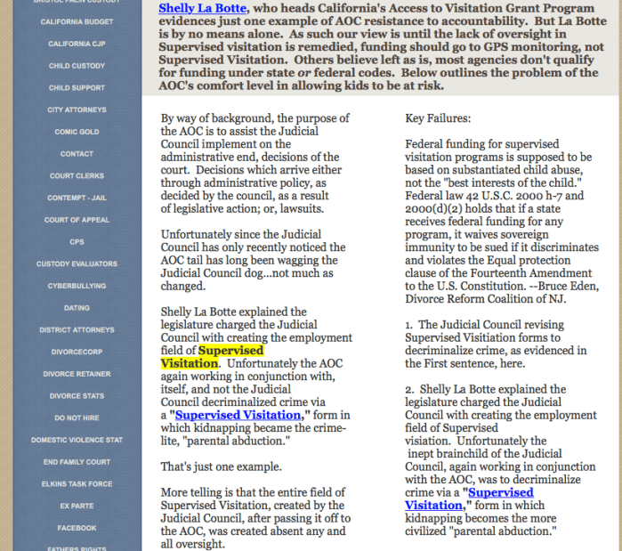 “Pleasepayattention” commenter on the Tabachnik (5/11/2017) article re: Reunification camps directed readers to (her) website FamilyLawCourts.com. I looked again for any comprehension of the private associations organizing to work the funding and court-referred services. Shelly LaBotte is associated with at least two I know (not to mention AFCC): SVN (Supervised Visitation Network) and CASVSP (acronym, whatever order it occurs in, refers to professionalization at the California STATE level of those supervised visitation professionals who get paid for it. Training, and getting legislation in place to mandate it — just for the professionals of course — was involved. Having a trainer/provider/association organizer presiding over federal grants to the state to fund the same profession is one big red flag. Where’s any reference to (ANY of this) in this context, on the website? (See my TOC for more on this, 2016 or possibly back in 2014 or before…)