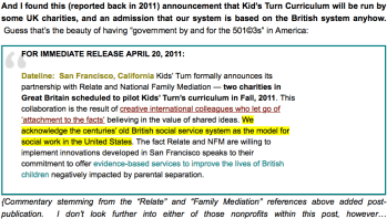 The connection to this topic comes through Kid’s Turn (San Francisco)’s aborption (merger, non-surviving entity) into a CAC (Child Advocacy Center) in San Francisco. I’d noticed this YEARS (about six to seven years!) ago and realized that the essence of the CAC network was running certain curricula and providing “co-located” interview centers similar to the concept behind the “Family Justice Centers” model. I also found it interesting that KT San Francisco decided to go “underground” in this manner AFTER some of us were blogging its strange financial contracts with the SF City and County (i.e., Superior Court) and of course noting its obvious AFCC connections. It was clearly into psycho-educationally innocculating children against “parental alienation” and parents from spreading that “disease” to them by virtue of living in the same household…