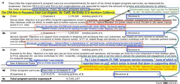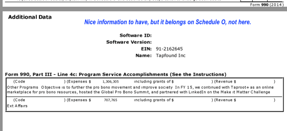 (Header info from Tapfound, Inc. omitted for size; this is Page 1, Summary, of a FY2014 Form 990). Notice Line 13, “grants to others” (which can be expressed as cash or non-cash on corresponding Schedule I) is “0.” Despite its own self-descriptions, this is NOT a “grantmaking” organization in IRS terms. Avoiding naming the grantees thus dodges accountability while it claims to want “transparency” for the pro bono market…. But notice there IS (Line 9 here) “program service revenue” reported. But on Page 2, (next image) NO such revenues are reported where they should be and by IRS Form 990 definition and Part III instructions, must be.
