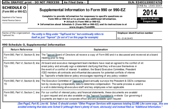 TapFound, Inc (dba Taproot Fndtn EIN#912162645 CalEntity (since 2002) 2374009 OAG CHar Details (4pp) -Nothing before FY2007 uploaded ~>FYchanges from and back to calendar yr (<==this annotated pdf shows a “schedule” of filings and is a good graphic showing growth of the entity over time. Also that it’s consistently (without exception) filing its RRFs late, and changed its fiscal year twice within a dozen years. And that the State OAG has failed to upload the earlier year’s documents…)