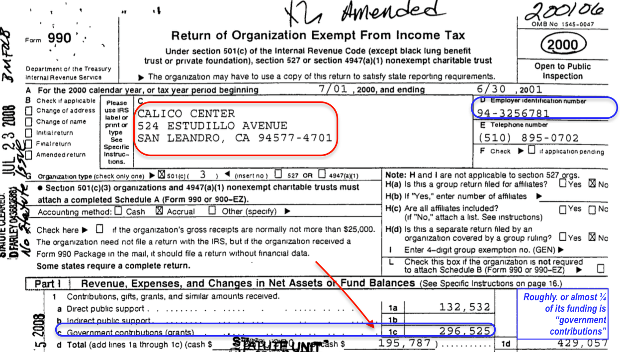 Page 1 of Calico Center FY2000 return displayed in two images here. Click each one to enlarge as needed.