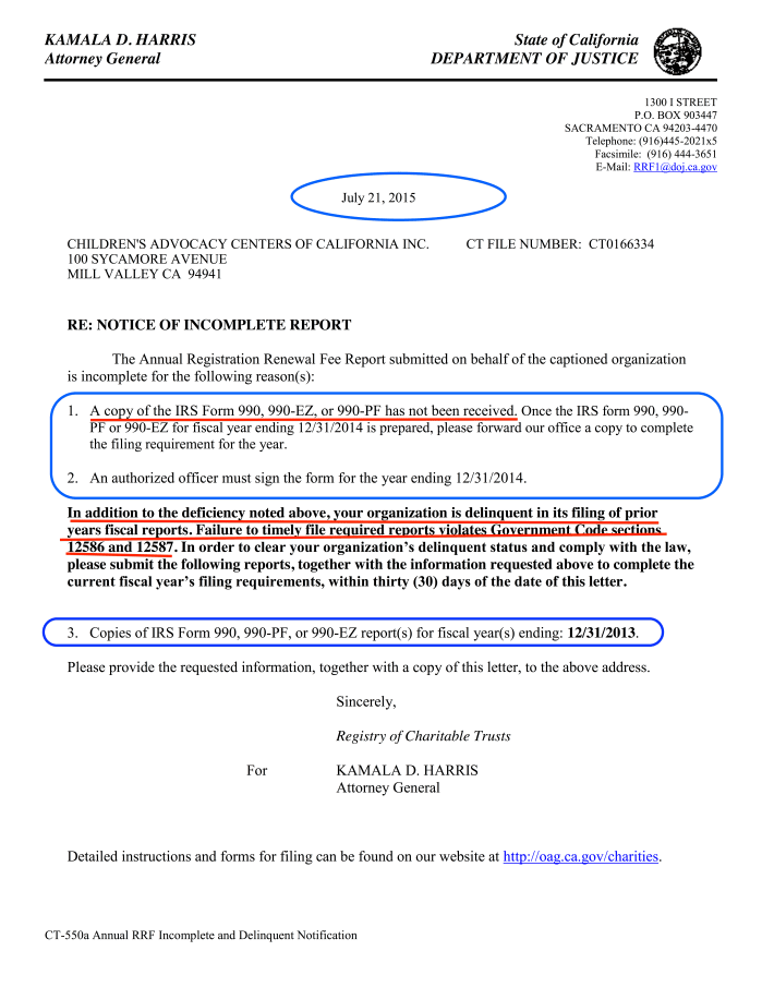 “Chasing Down Corporate and Charitable Registrations for Court-Connected Nonprofits” (Such as Kids’ Turn SD, SVN, and others) and Their Donors). Part 1. [Revisiting-viewing-formatting my Aug. 31, 2011 post @ Jan. 2018]. » Calif OAG July 21 2015 ltr to CACC, Inc – Where’s Your FY2014 990? No Auth’zd Officer Signature~>+ Where’s your FY2013 990?! (1pg) (viewed 2018Jan3)