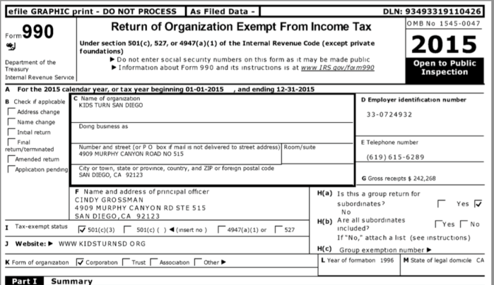 Latest Tax Return available – FY2015 only. (KTSD = EI#N33-0724932) The entity doesn’t file even the simplest tax returns on time, and its board is full of lawyers. See “Gross receipts”.