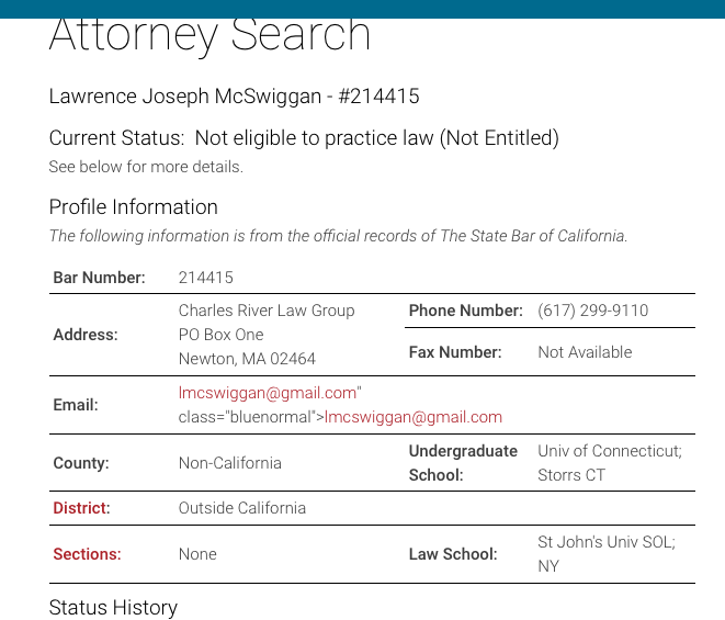 Refers to a specific Lawrence Joseph McSwiggan, CalBar# 214415 which may or may not be the sole incorporator of TapFound in 2002.