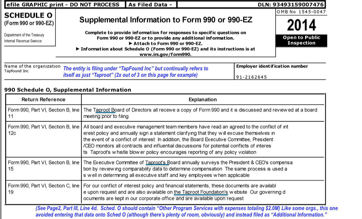 Chasing Down … Court-Connected Nonprofits and Their Donors, Part 2 (Kid’s Turn San Diego gets Development Help from Taproot Foundation, Inc.(see ‘Gen3 Draper-Richards Venture Philanthropy’) and SVN, the Supervised Visitation Network. » TapFound, Inc (the TapRoot Fndtn, CA, 2002ff) 990FY2014 (YESep30 2015) EIN#912162645 Gross receipts 5M~ Viewed 2018Jan01 Mon @12.32.14 PM