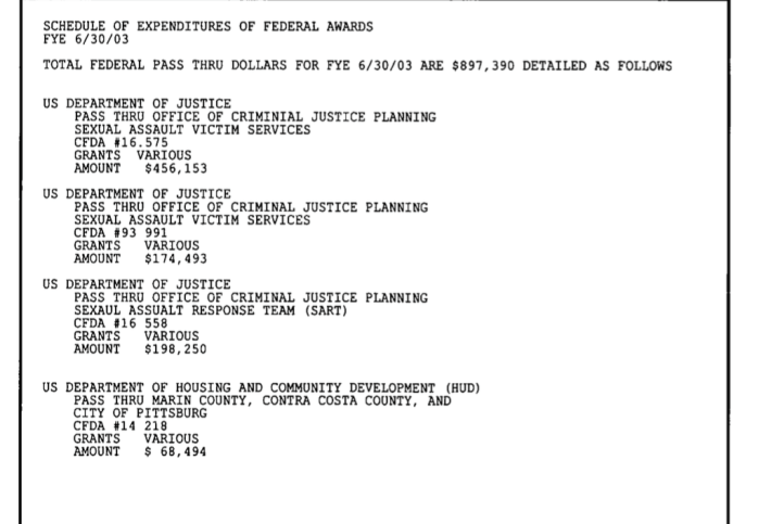 Jumping through Hoops and Chasing One’s Tail, that is, if Conceptual Clarity on “CACs” ~~>And Navigating The Money Mazes Set up By Them~~> is the Goal. (This Example: Calico Center (San Leandro, CA) payees). » Community Violence Solutions (CVSolutions’org) FY2002 Form 990 (YEJun30) EIN#942411924 also shows Federal pass-through funding (USDOJ + HUD via 2 countys and 1 city SShots2018Jan8 Mon @3