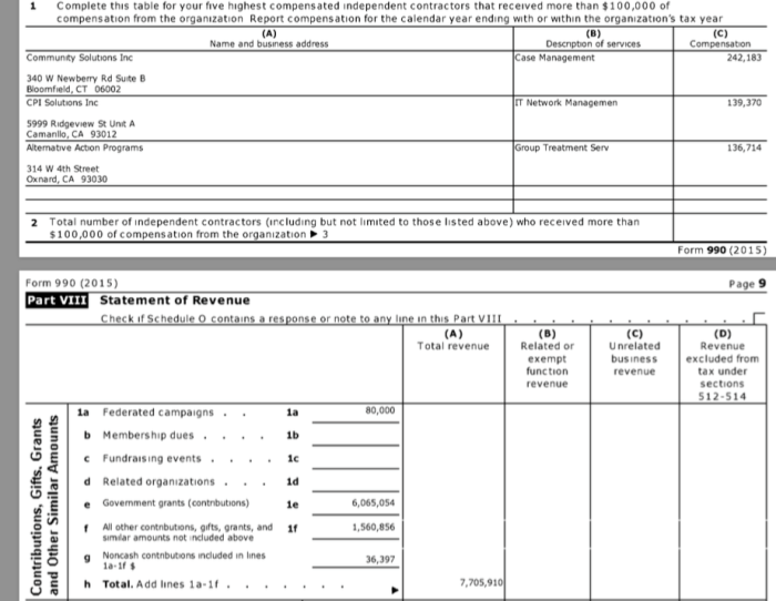 Pt. VIIA (top) Farming out case managemt to a group in Connecticut?? (!) Main revs, naturally, Gov’t Grants (Pt VIII, bottom of image)