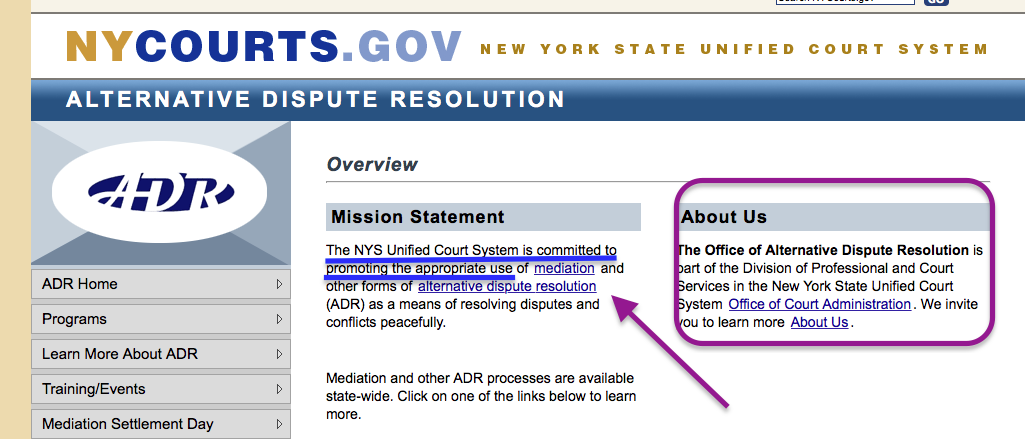 NYS Unified Court System (NYCourts’gov) Office of ADR is under Div Profess + COURT SERVICES under OFFICE of Court Admin (in Cal, that’d be AOC?)