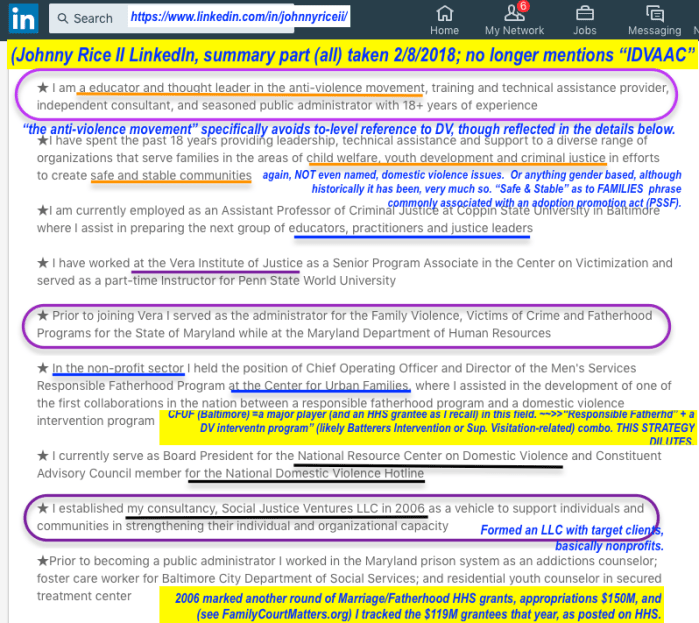 Johnny Rice II Linkedin, Annotated (pardon the fine print — not much space there!) Second yellow comment: “CFUF (Baltimore) =a major player (and an HHS grantee as I recall) in this field. ~~>>“Responsible Fatherhd” + a DV interventn program” (likely Batterers Intervention or Sup. Visitation-related) combo = STRATEGIC “coup.” As in the for-profit corporate world, getting on the boards and/or key positions can also be — and in the “DV Constituency” field, it has been — part of a takeover strategy. It’s incremental over time, and disbursed, but fathers’ rights activists have over time increasingly positioned themselves on DV boards; and feminist (so-called) leadership has said, “come-on in.” Here, however, CFUF was specifically focused on men, but involved in DV programming also, which as a “thought leader” (top of LinkedIn” trainer and educator, the individual seems proud of.