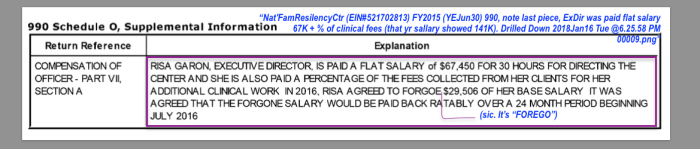 The Missing Link, Barely Buried on PAS.FamiliesChange.CA.gov (‘Resource|Publications|Books’), and where ‘CA,’ nominally, MAYBE still stands for California, but … » Nat’FamResilencyCtr (EIN#521702813) FY2015 (YEJun30) 990, note last piece, ExDir was paid flat salary 67K + % of clinical fees (that yr sallary showed 141K). Drilled Down 2018Jan16 Tue @