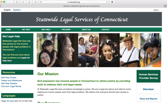Apparently Statewide Legal Services with the help of a project (website | CTLawHelp) referred to as though it was a person (typical!) collaborated with JES; so I looked at its page (top, next image, bottom, white print on dark green)