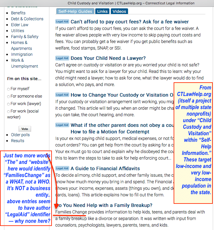 Selfhelp at CTLaw.org references FamiliesChange, without identifying it, however. Note other references above it provided through or authored by (?) Legal Aid (CTLawHelp.org =/= Statewide Legal Services of CT. In fact, the former seems to be a WHAT (website) not a WHO anyhow…