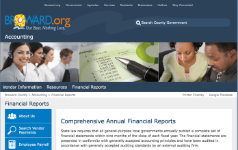 BrowardCountyFL (Broward’org) CAFRs easy to find + well explained (etc.)…#2 of 3: Menu heading is, appropriately, “Financial Reports” with subtitle [CAFRs] which is concisely described, and (as I recall) simple, FULLY labeled by type of report and year, a simple list with just a moderate bit of white space between the links. In other words, page “real estate” is used thoughtfully without requiring more scrolling, or zoom functions to view the whole.