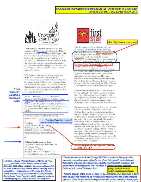 It is also (shown in various newsletters) copying a format used, successfully it seems, by a law professor at University of San Diego for “CAI” (CHILDREN’S ADVOCACY INSTITUTE), which is by way of reference to Robert Fellmeth — also on the board of another foundation/nonprofit grouping (East Coast, West Coast) — First Star (the nonprofit based in DC) and, perhaps the name was First Star in Los Angeles, where the latter was a pun on the word “star” (a primary founder being a actor Peter Samuelson). (Notice listing of Fellmeth of CAI on its board).