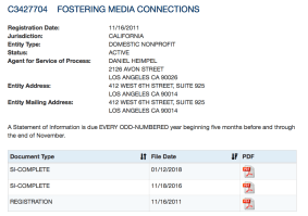 Fostering Media Connections, Inc. (FMC) was only spun off from DC’s (legal domicile Virginia’s) 2001ff “Congressional Coalition on Adoption,” (CCAI) which was significant enough I featured it, for years, as a “sticky posts’ and it’s still on the list of my Top Ten Key Posts. FMC meanwhile is a noncompliant (Delinquent) nonprofit at the state charity level, active at the Secretary of State level, although it hasn’t provided the Attorney General’s Office (judging by their registry of charitable trusts) a Form 990 since its FY2013 (!!) YE June 2014