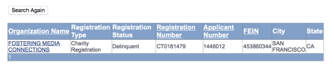 FMC [Incorp only in Nov. 2011 per Sec of State] here as a Charity (EIN# is shown) is “Delinquent” viewed mid-Feb. 2018. Staying Status Current isn’t exactly a tough task — file annual required RRF (and any attendant fees). Answer a one-page Y/NO questionnaire (only 8 questions!) if there’s a “Y” attach explanation (for example, any: gov’t grants, professional fund-raiser, audited financial statemt, etc.). A delinquent status can be corrected, BUT what’s odd (details show) is that FMC hasn’t provided ANY Form 990s to the OAG as required, apparently EVER, or either 990 or RRF (as also required annually within 4.5 months of end of fiscal year) since it seems FY2013 — and the RCT/OAG hasn’t even sent a warning letter, or request they send it. Qualifier: Above statemt comes from the OAG/RCT’s own database (“Details” level)…
