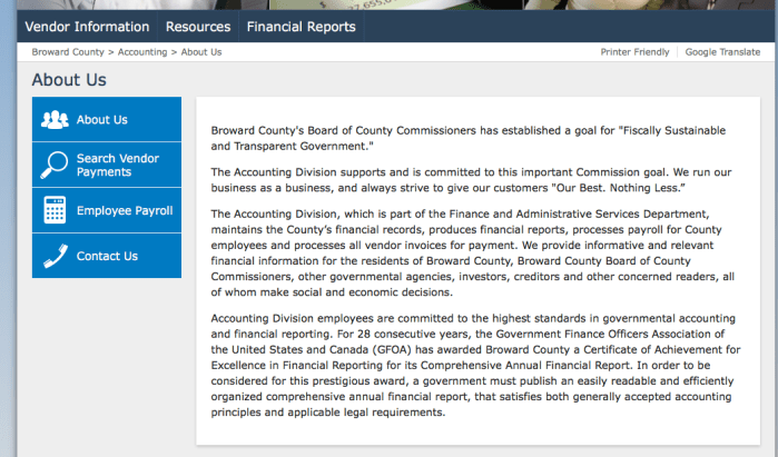 BrowardCountyFL (Broward’org) CAFRs easy to find + well explained (etc.)…#2 of 3: Menu heading is, appropriately, “Financial Reports” with subtitle [CAFRs] which is concisely described, and (as I recall) simple, FULLY labeled by type of report and year, a simple list with just a moderate bit of white space between the links. In other words, page “real estate” is used thoughtfully without requiring more scrolling, or zoom functions to view the whole.