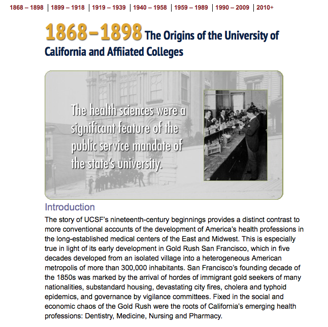 Click image to enlarge or see “1868-1898: The Origins of the U of Calif and Affiliated Colleges,” courtesy History.Library.UCSF.edu