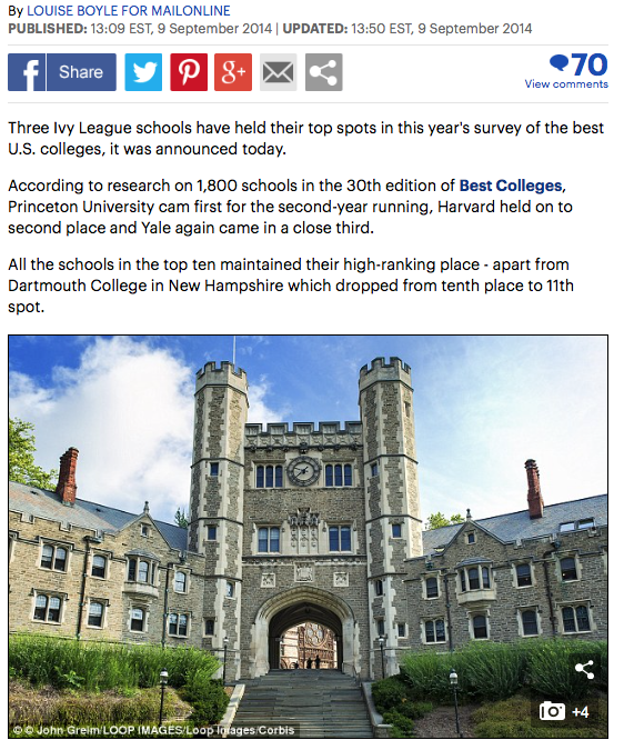 From “Ivy League Reigns Supreme as Princeton, Harvard Yale come out on top for second year running in US college rankings” in Dailymail.co.UK (refers to 2014-15)