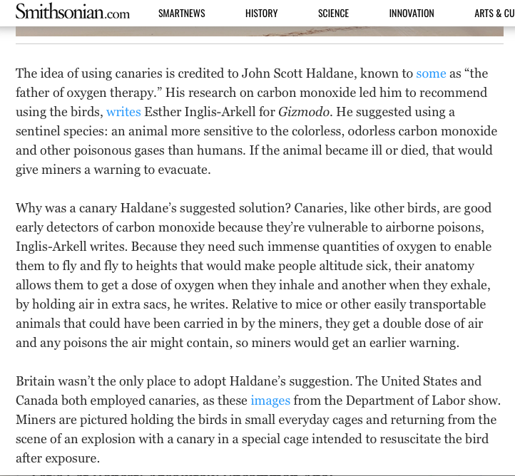 The Story of the Real Canary in the Coal Mines 12/30/2016 in Smithsonian.com, under “SMARTNews”) by Kat Eschner. (click image to enlarge or link to access the article).