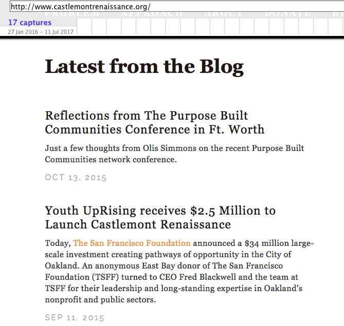 Seven Posts from December, 2017 (Informal TOC Update @ March 14, 2018) [Short-link ends ‘-8MD’]. » Castlemont Renaissance (cf YouthUprising,PurposeBuiltCommunities, TheSF Foundtn’s 2015 34MM Invstmt in Oakland) WaybackMachine Images (my FirstFiveYears blog Feb 27 2018)<~2018Mar3 Sat @