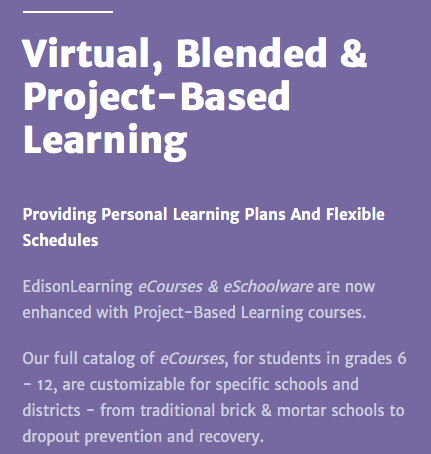 Edison Learning (™) screenshot under the heading shown. See also their “Turnaround Schools, Charters” section which features the East Lake (“Drew”) charter school FIRST. Not reference on the brief description (with no links to more info on it on the site) is how very many other forces, foundations (plural) and LLCs were involved, as well as public housing funds, and personal control (through board directorship) maintained by project developers maintained throughout.