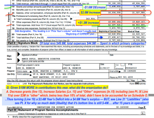 Pg1 Bottom, FY2016, entity “IPA” asking a few pointed questions how the negative bottom line was maintained. To answer in part, the main portion of liabilities is simply Pt. X Line 19, “Deferred revenue.” There was also “other Liabilities” which the supporting Sched. D. showed was simply a $1.2M “Line of Credit.” These are not “Notes,” mortgages, it seems, but optional ways of handling their own accounting.