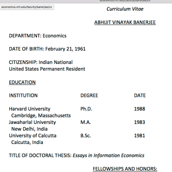 Three graduate advisors at MIT were mentioned. I looked up the CV and bio blurb (at MIT) of just the first one, Dr. BanerJee, and noticed that throughout several pages of publications, co-author included “Duflo.”